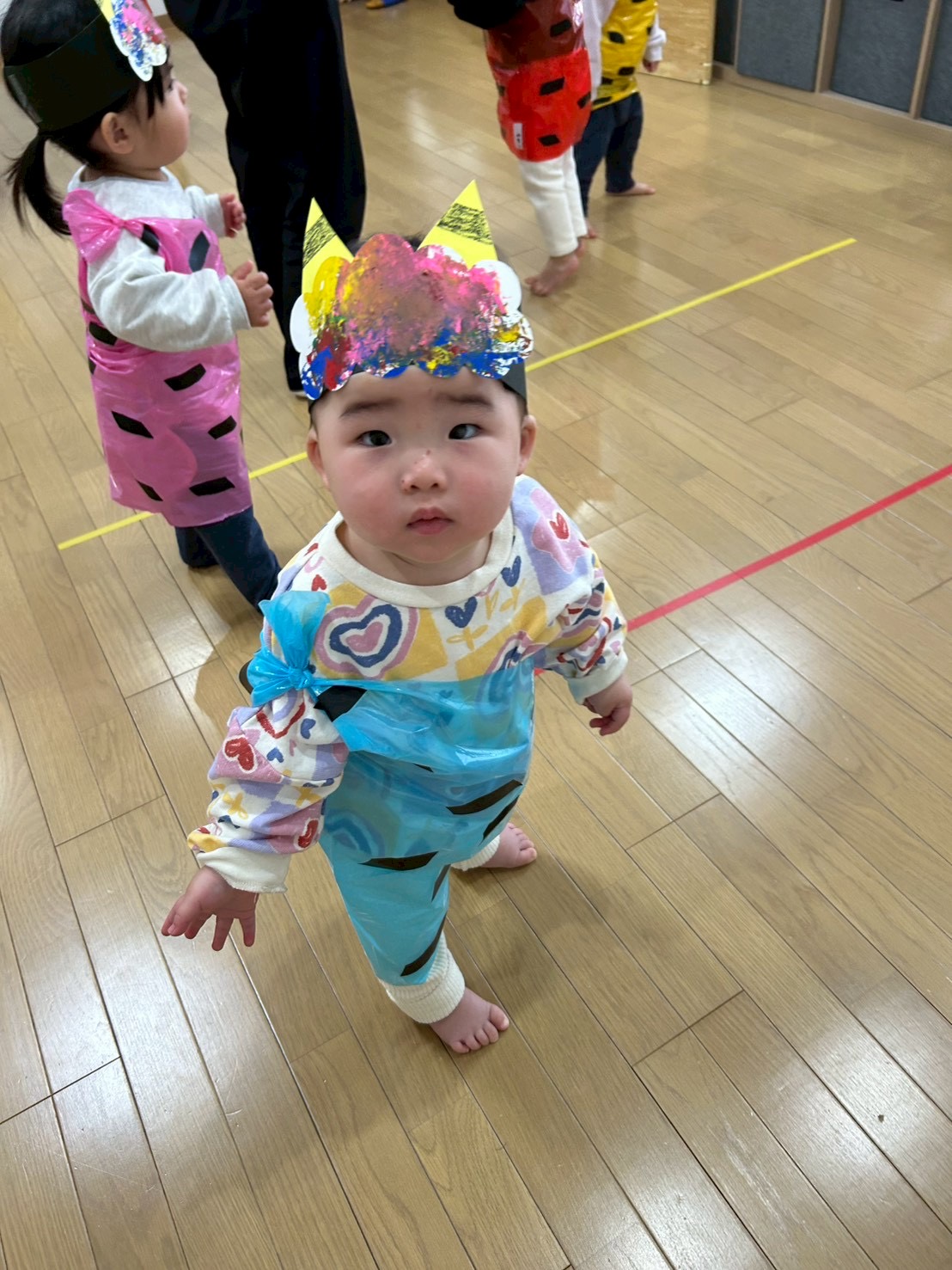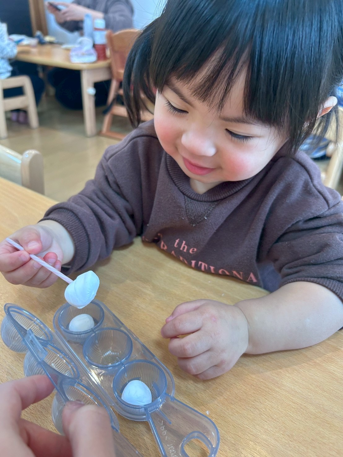 2歳児のパンダ組さんは、勇気を振り絞って「おにはーそとー」「ふくはーうちー」と鬼さんにボールを投げてくれました👏👏👏