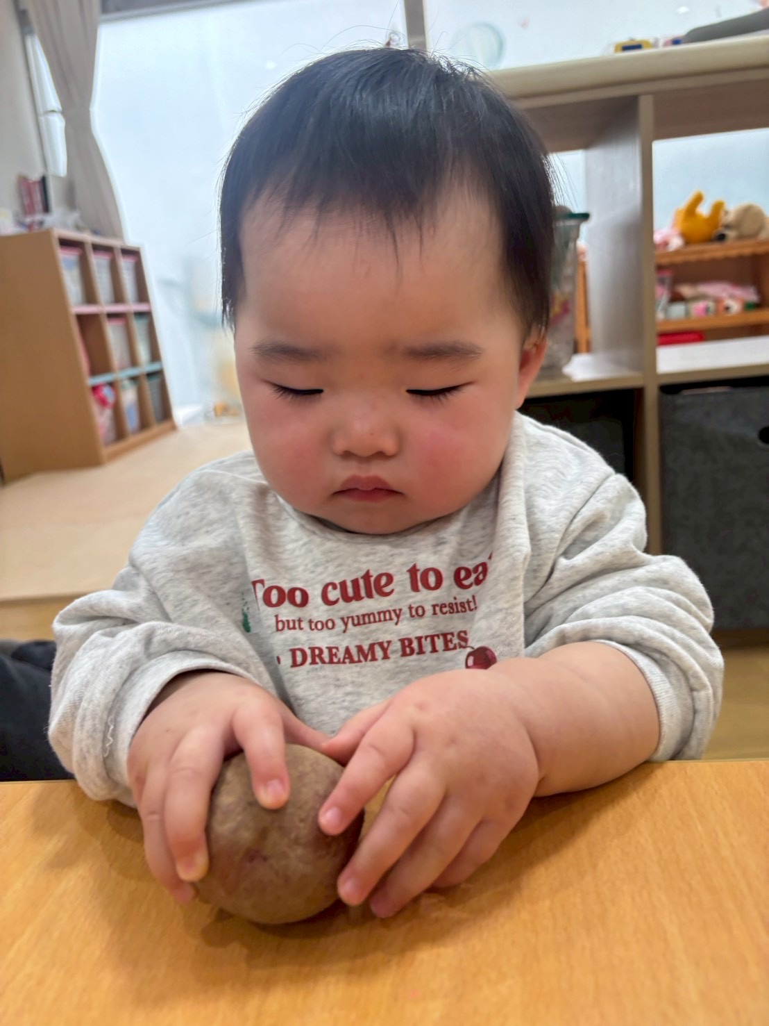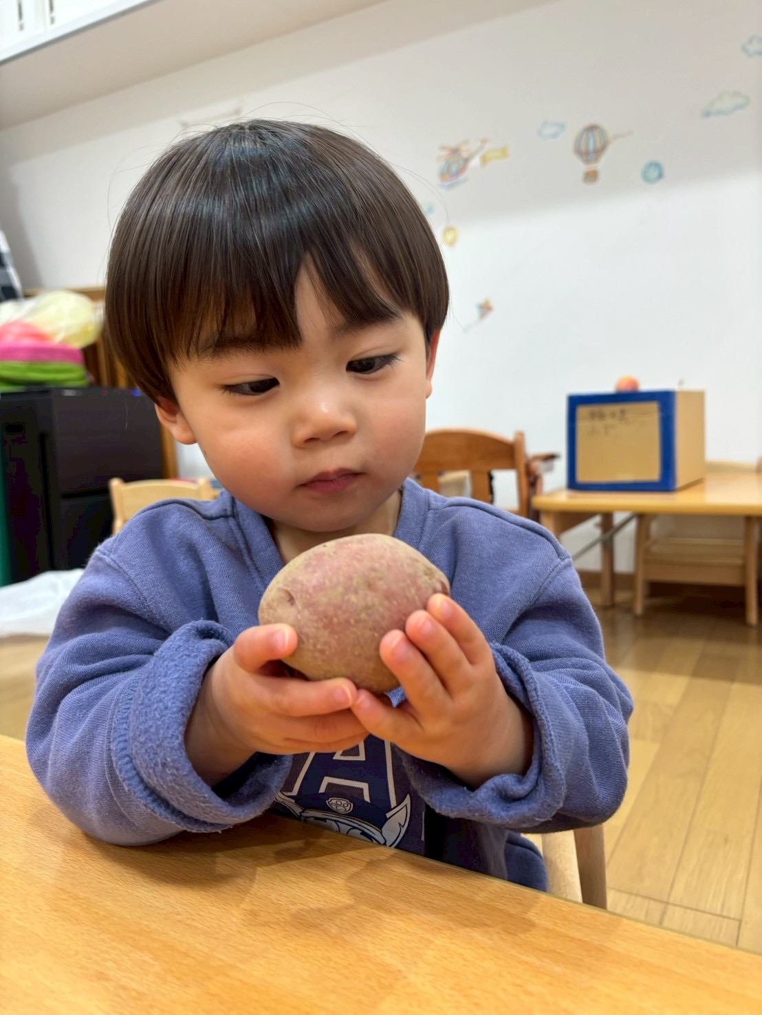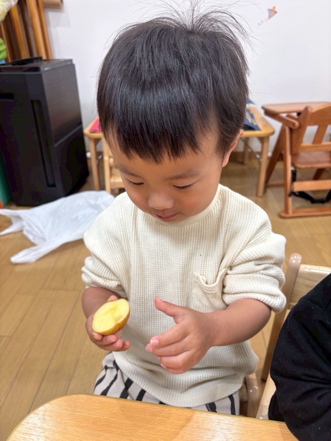 じゃがいもの紙芝居をみて3種類のじゃがいもを触ったり匂いを嗅いでみたり、包丁で半分に切り色の違いを見てみましたよ✨
