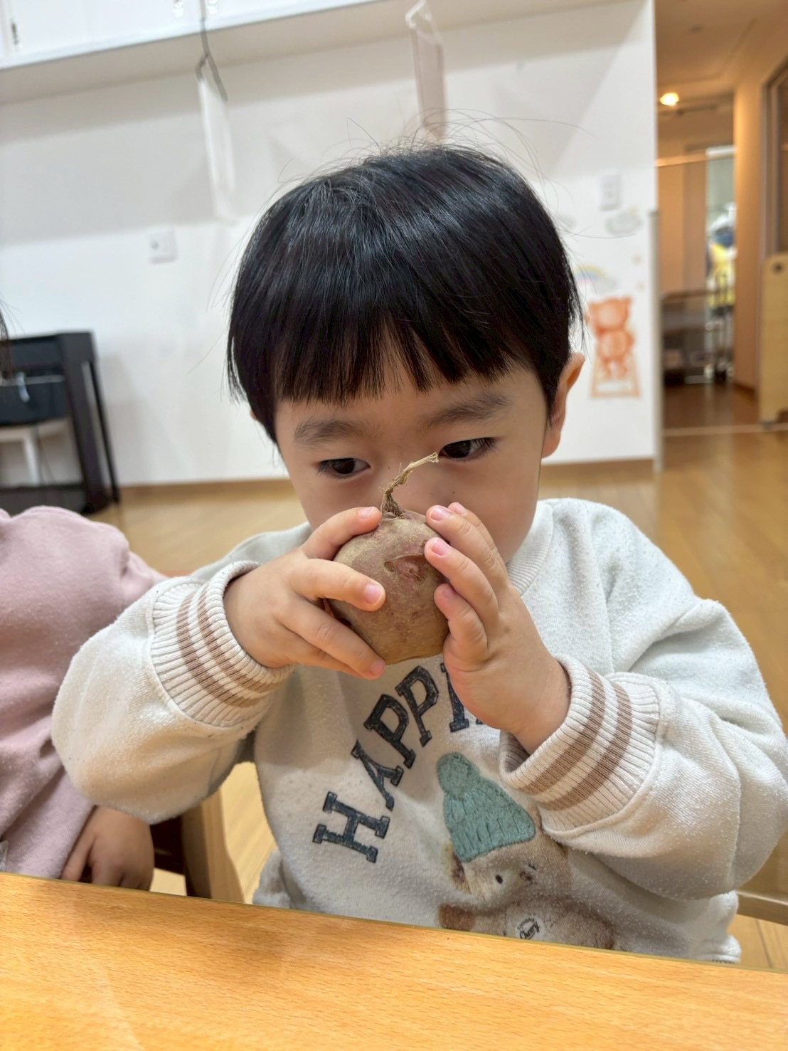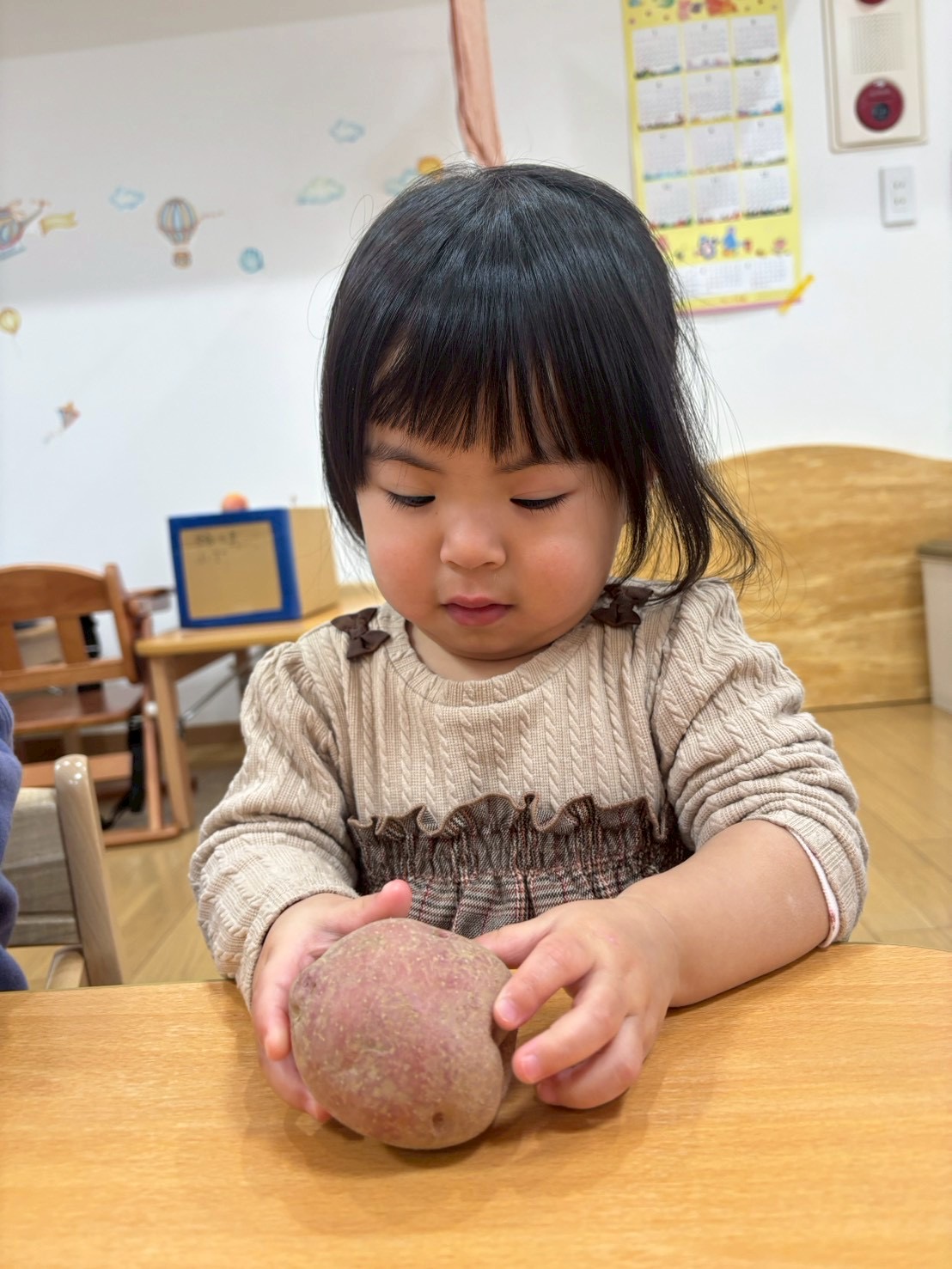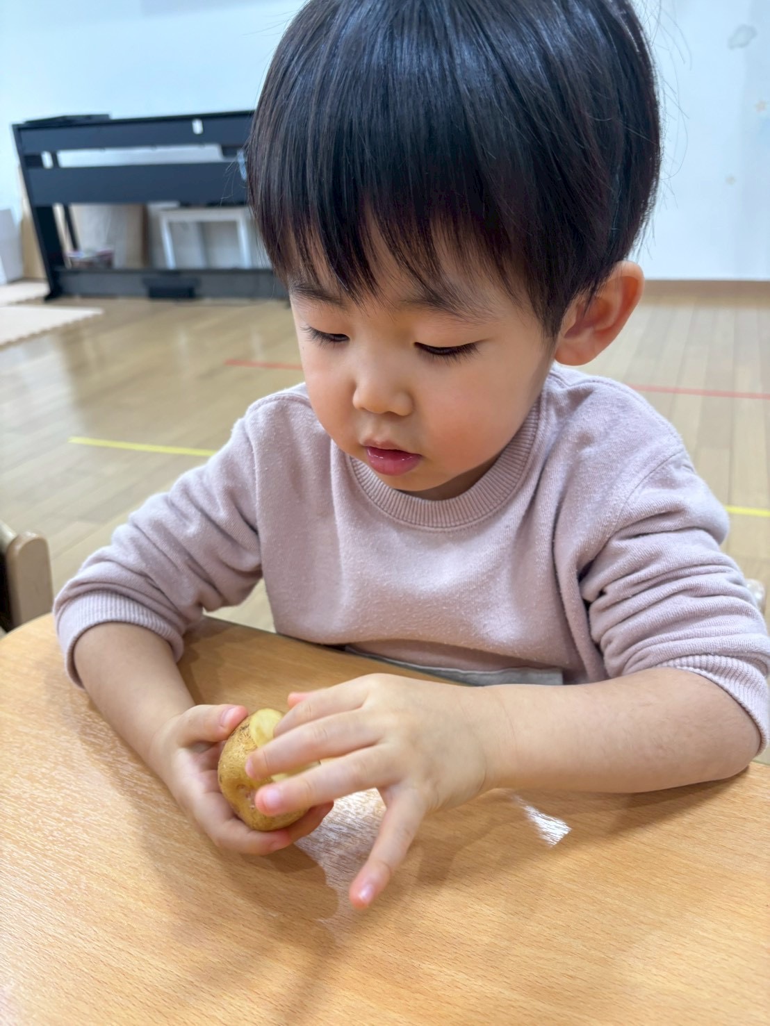 じゃがいもの紙芝居をみて3種類のじゃがいもを触ったり匂いを嗅いでみたり、包丁で半分に切り色の違いを見てみましたよ✨