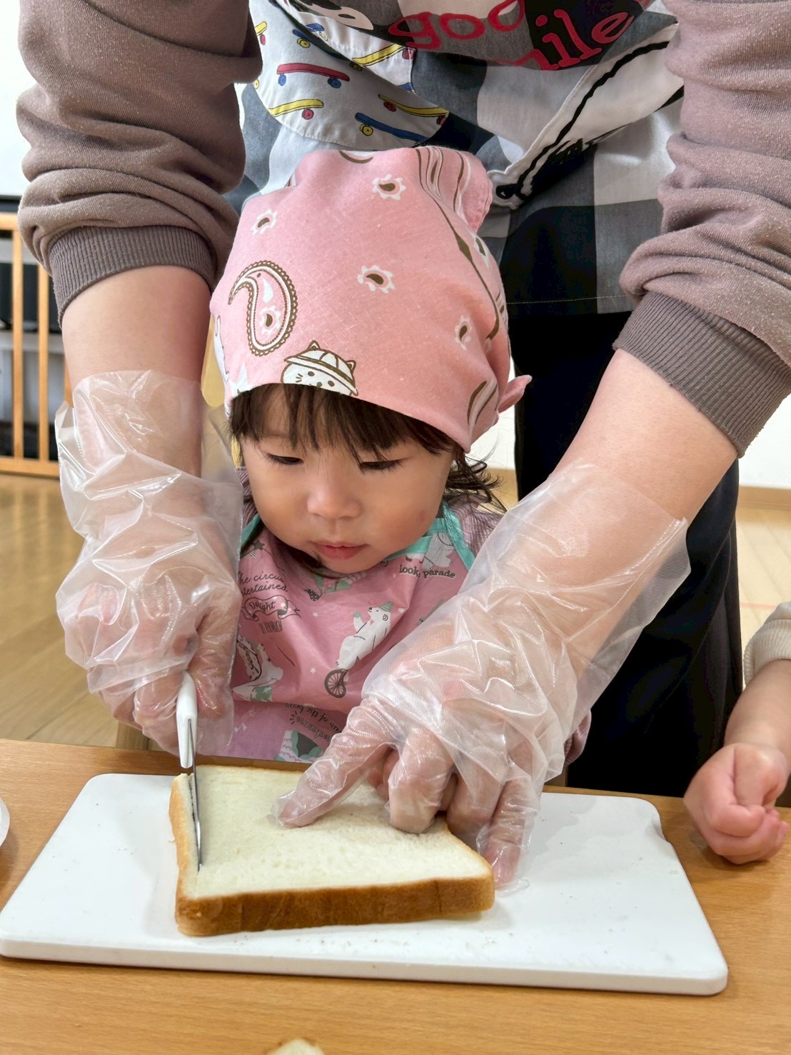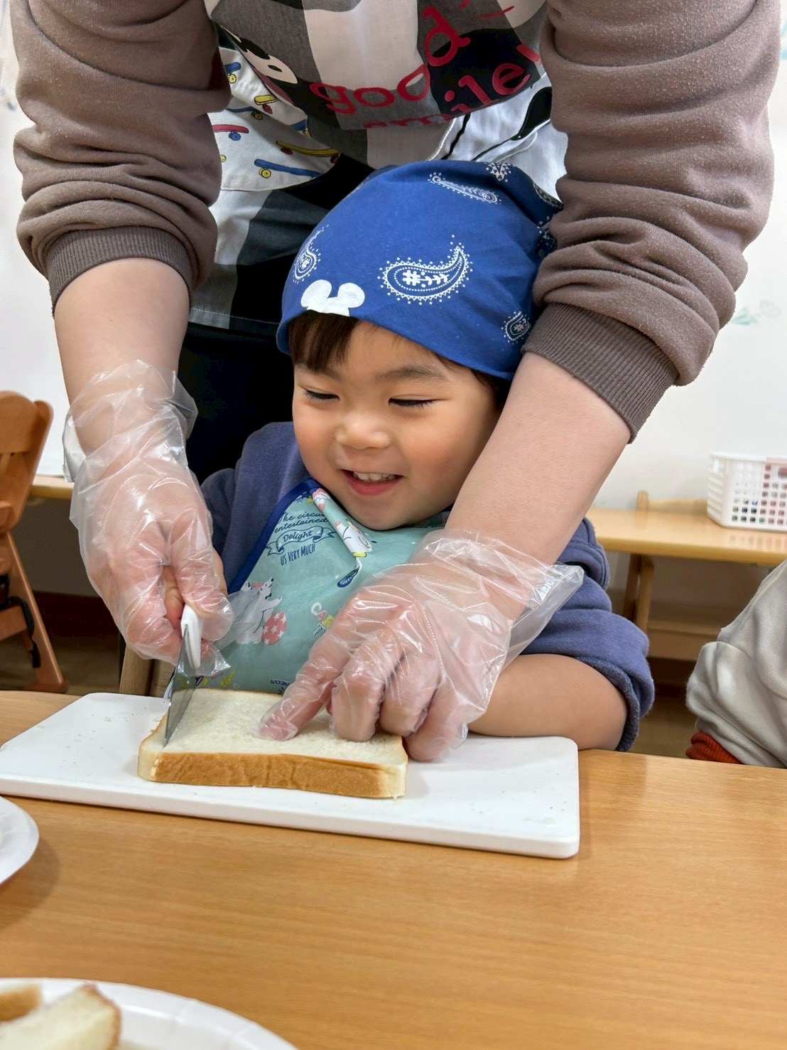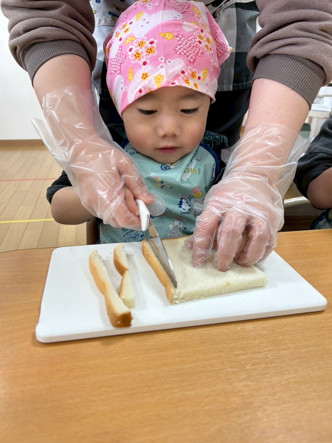 パンの耳を保育士と一緒にカットし…