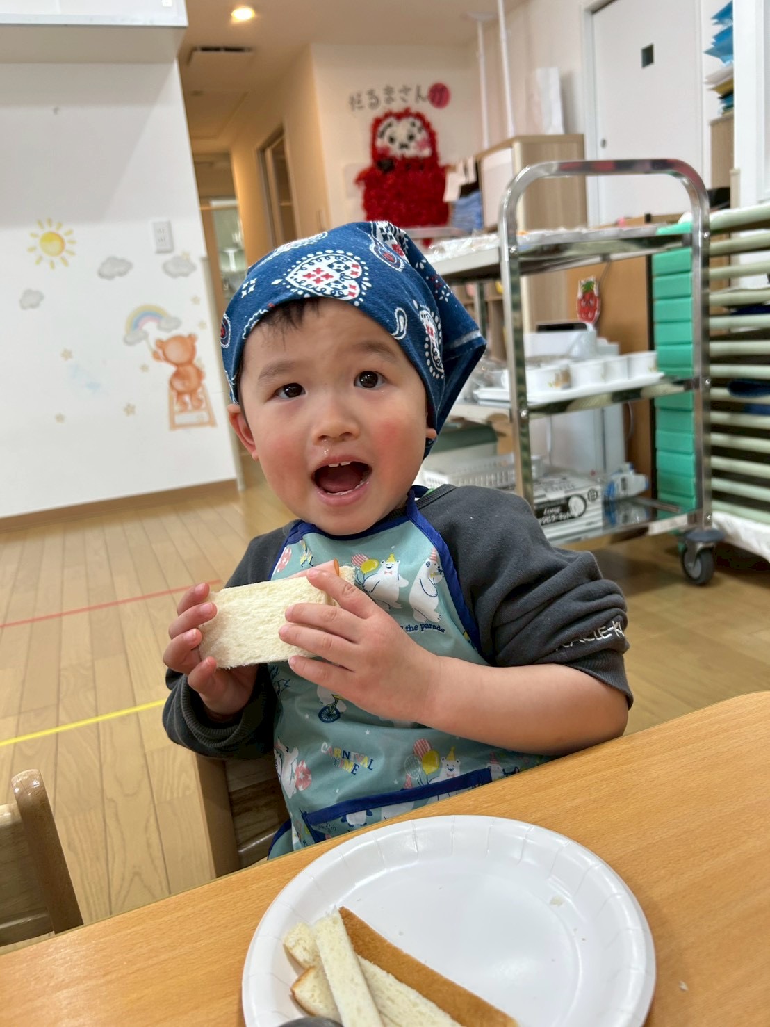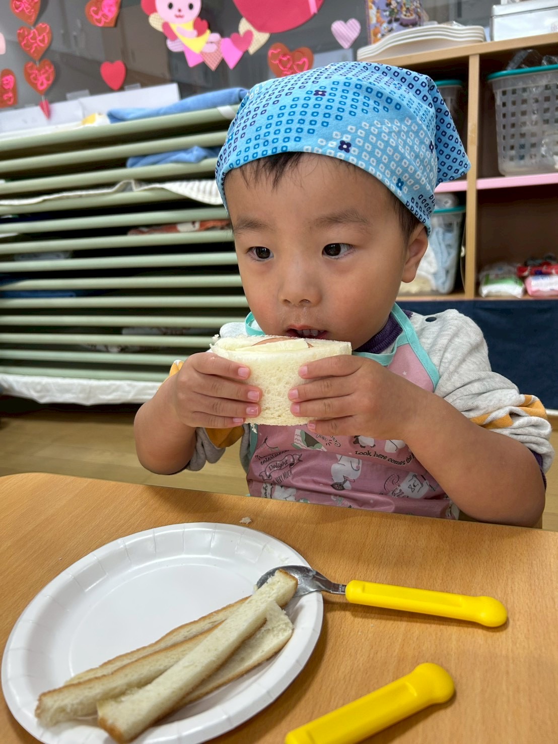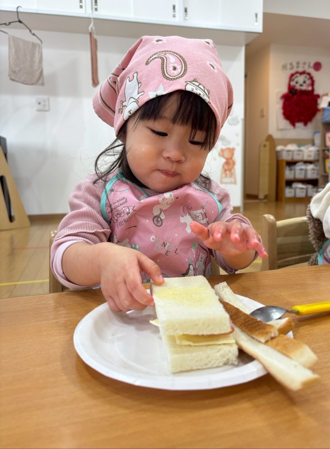 パンの耳を保育士と一緒にカットし…