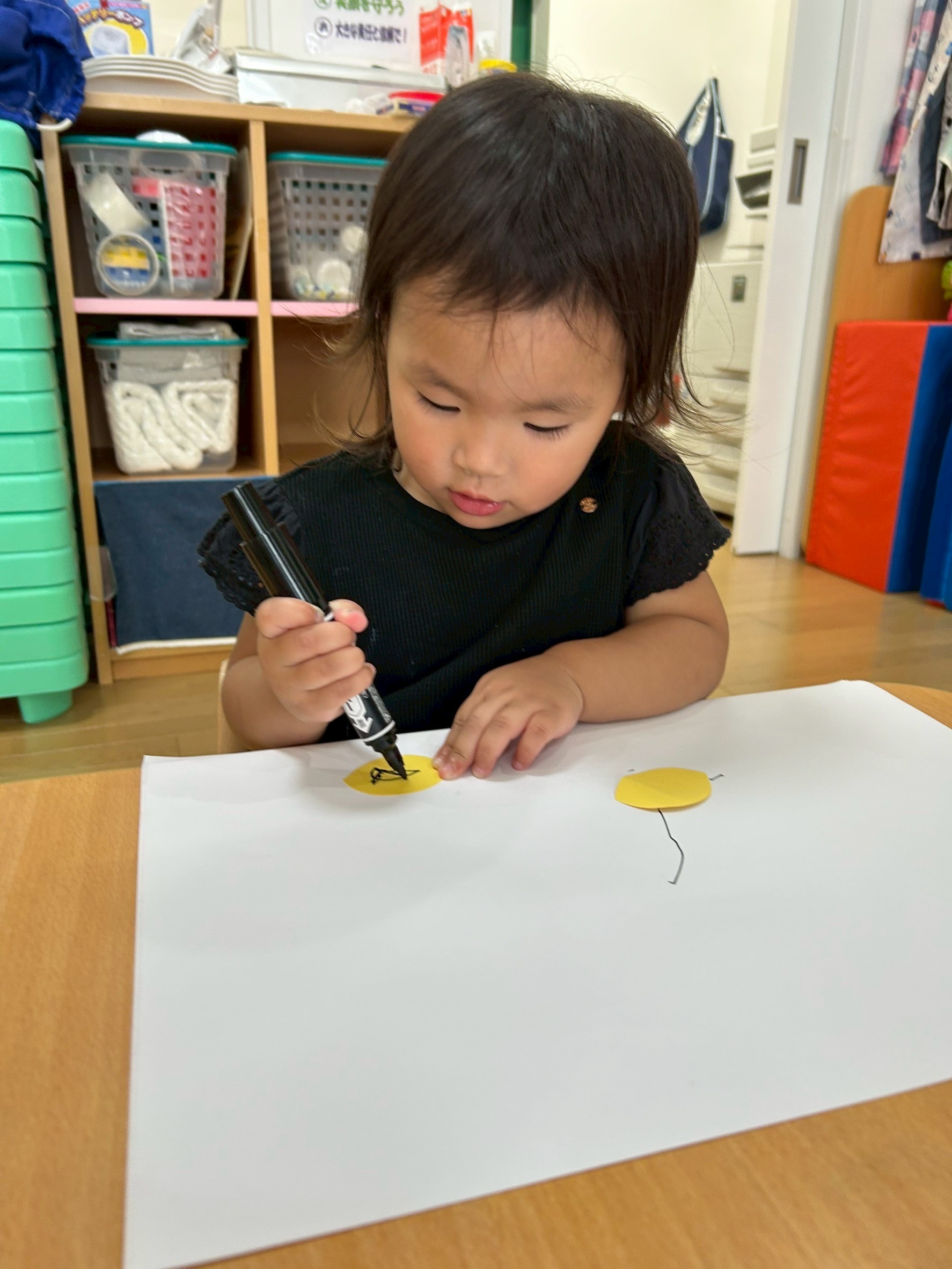 0、1歳児さんは綿棒でスタンプ、2歳児さんは指絵の具ですいかの種を描きました☘️