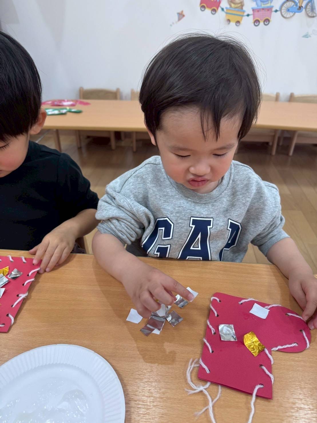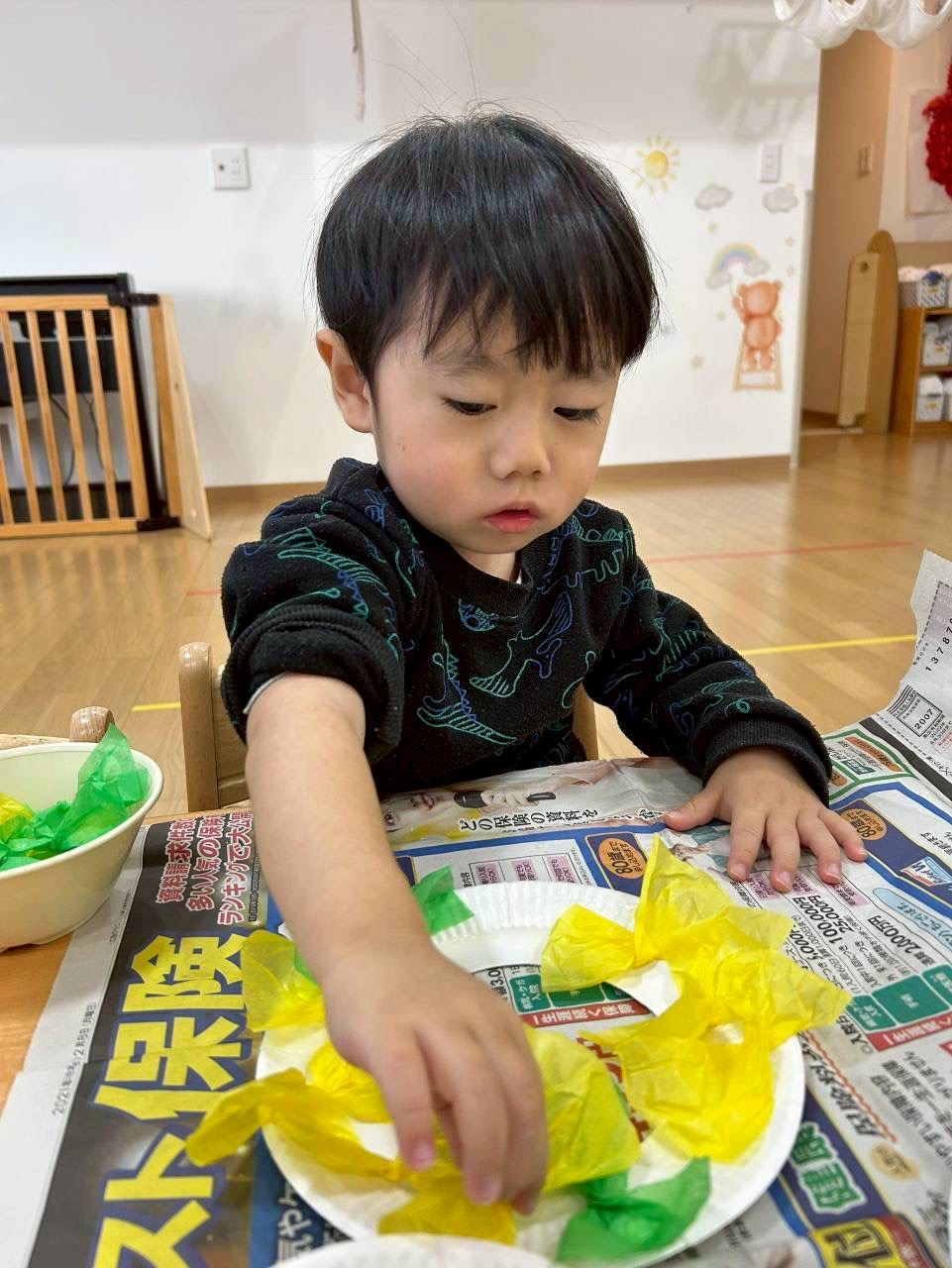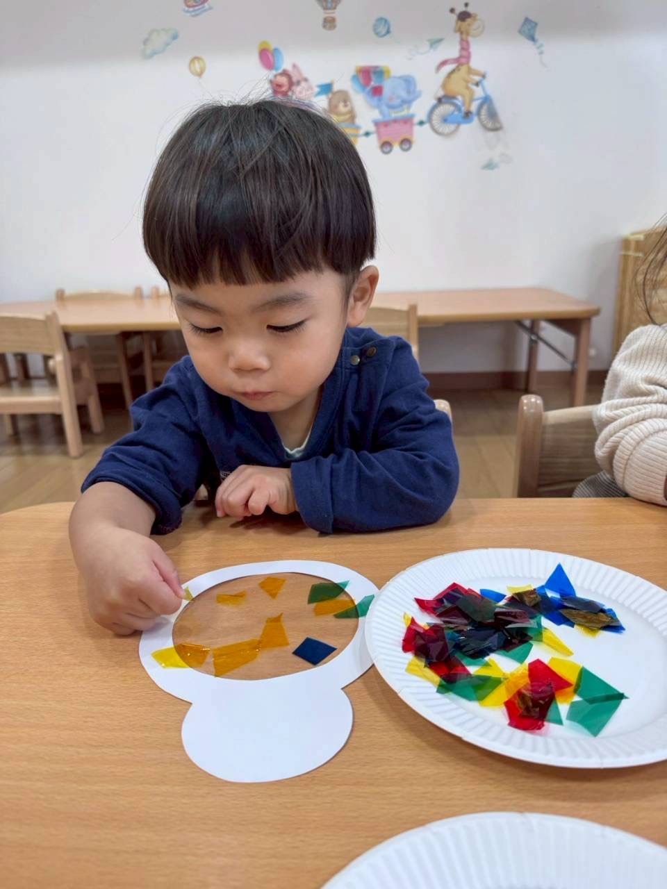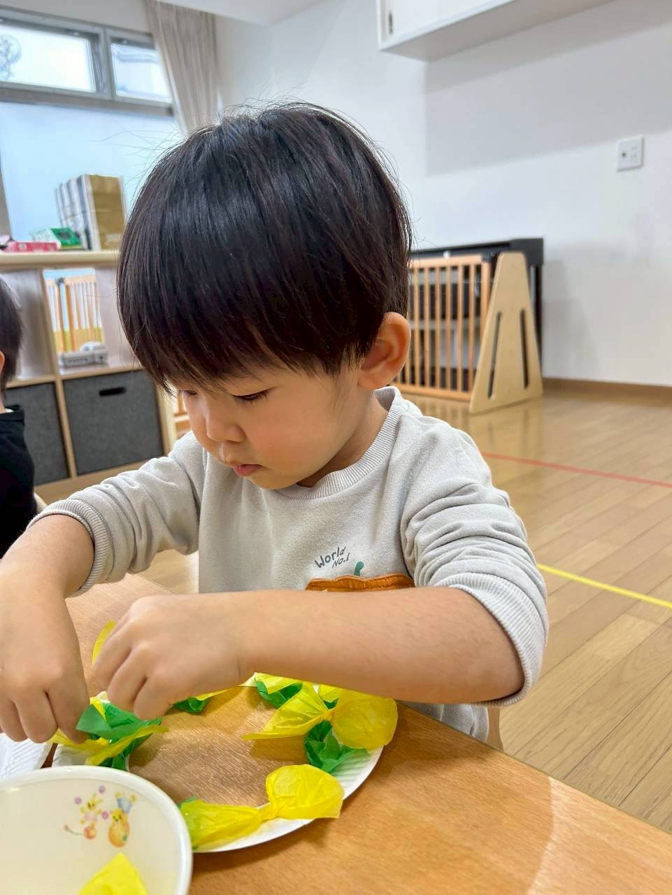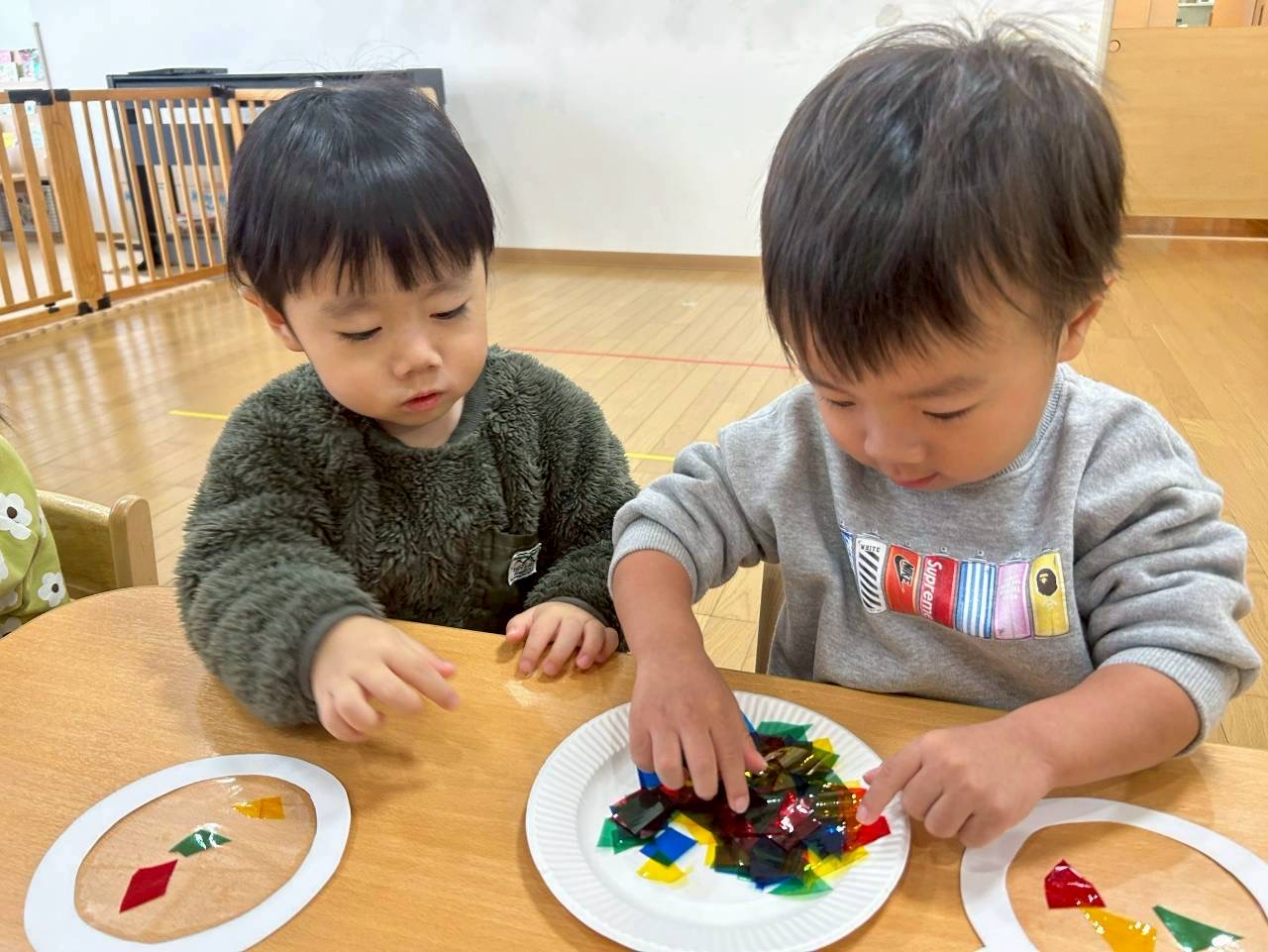 2歳児さんはリボン型の花紙をノリでペッタンと貼りました🎀