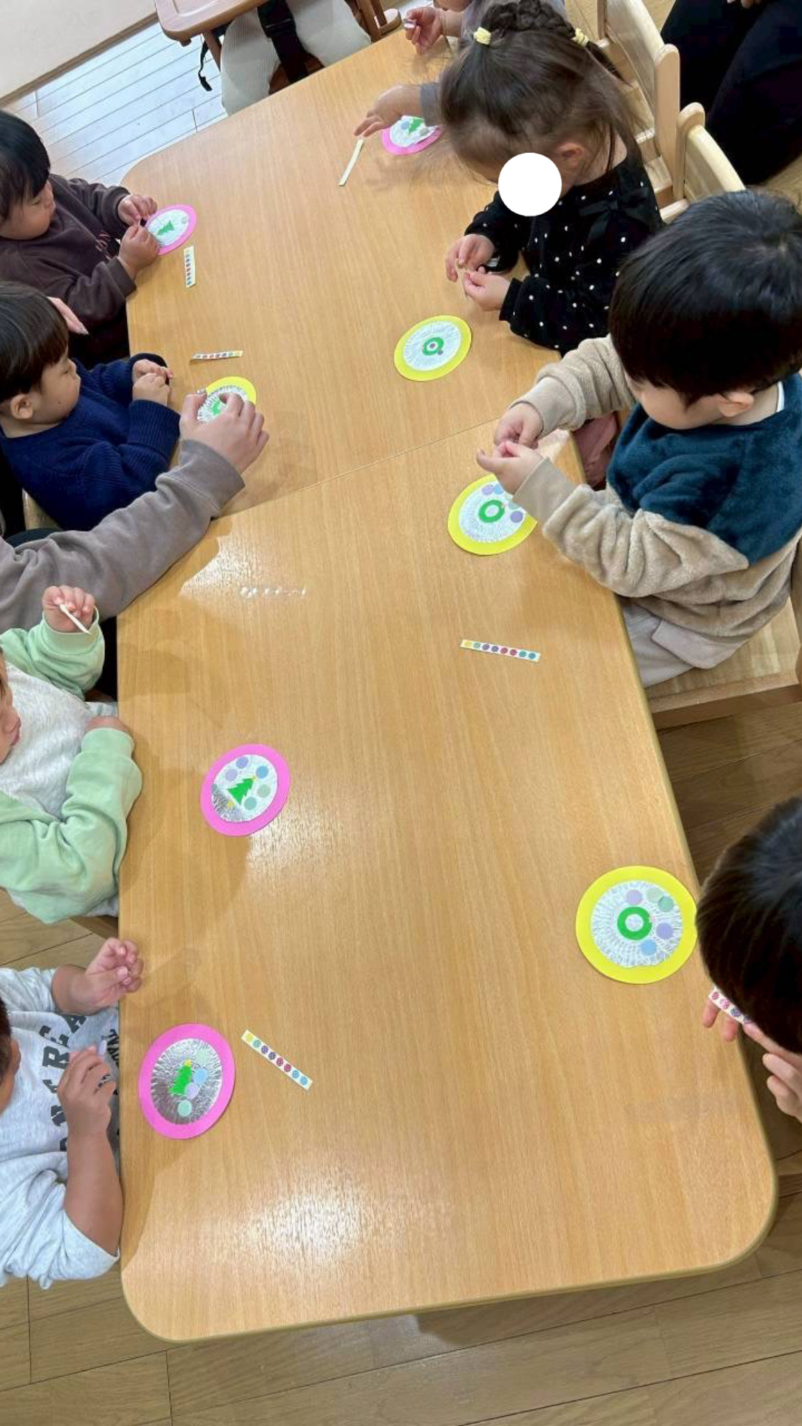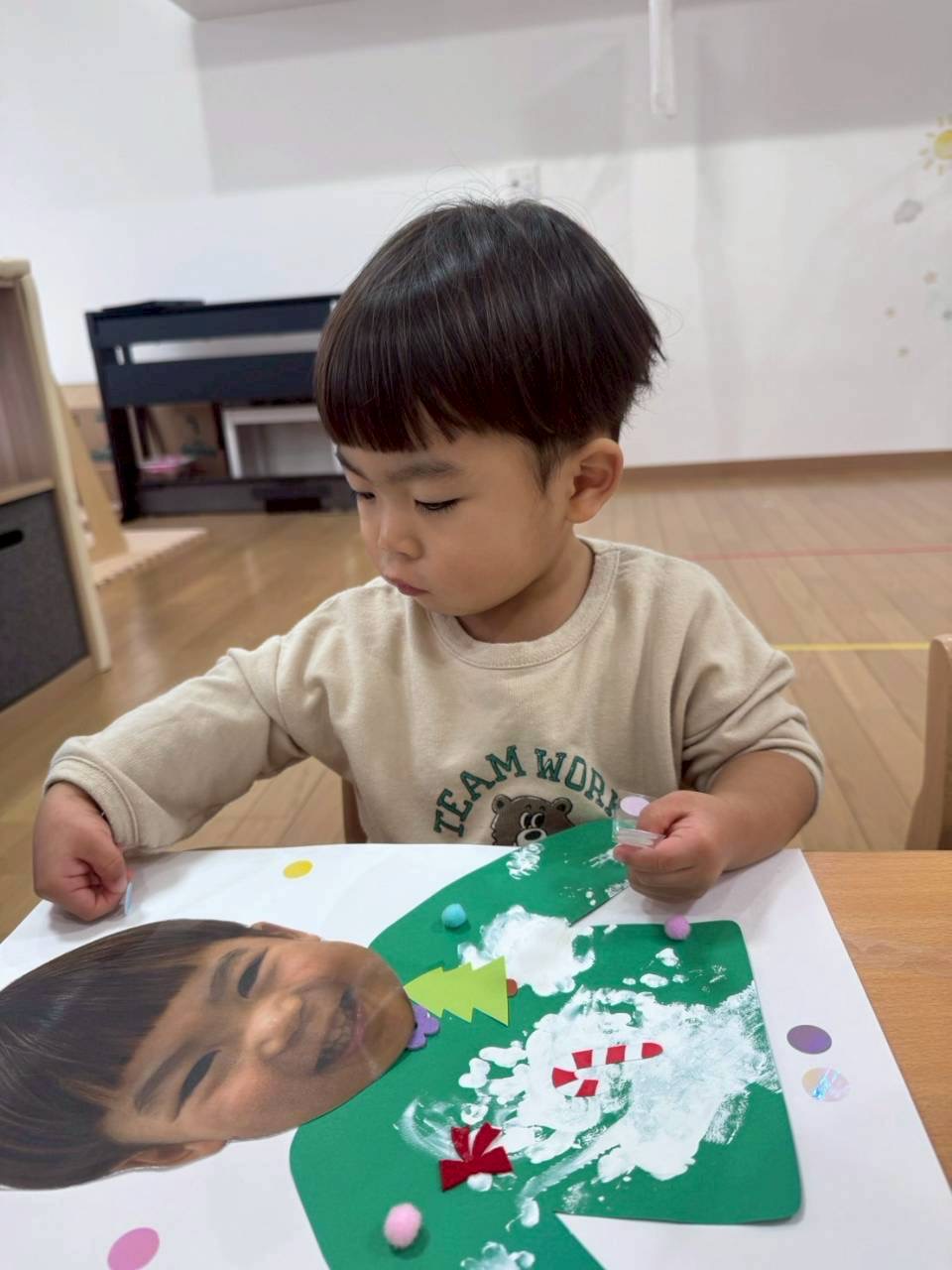 クリスマスならではの絵柄のフェルトなどをペタペタ。自分のお顔を貼り、その周りに丸シールを貼って完成です***