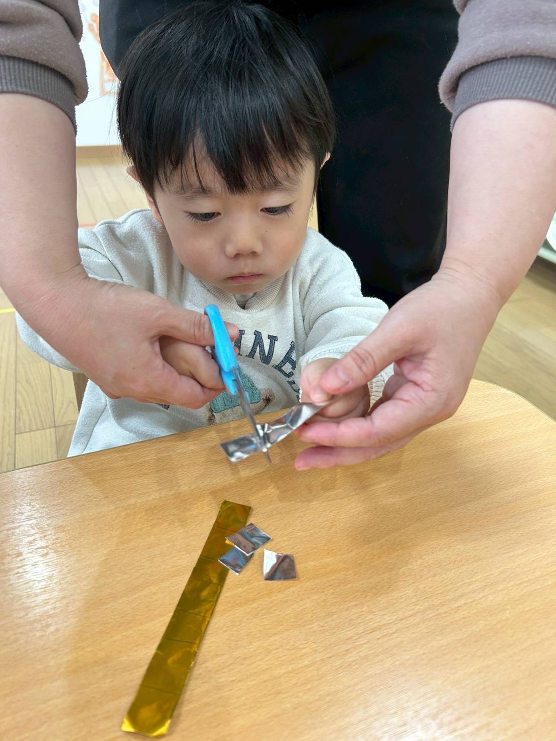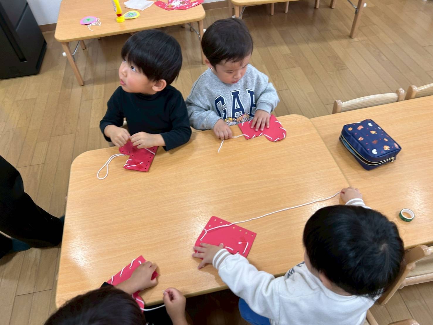 2歳児さんは紐通しをしたり、はさみにも挑戦しながら自分だけの靴下を作ってみました🌈
