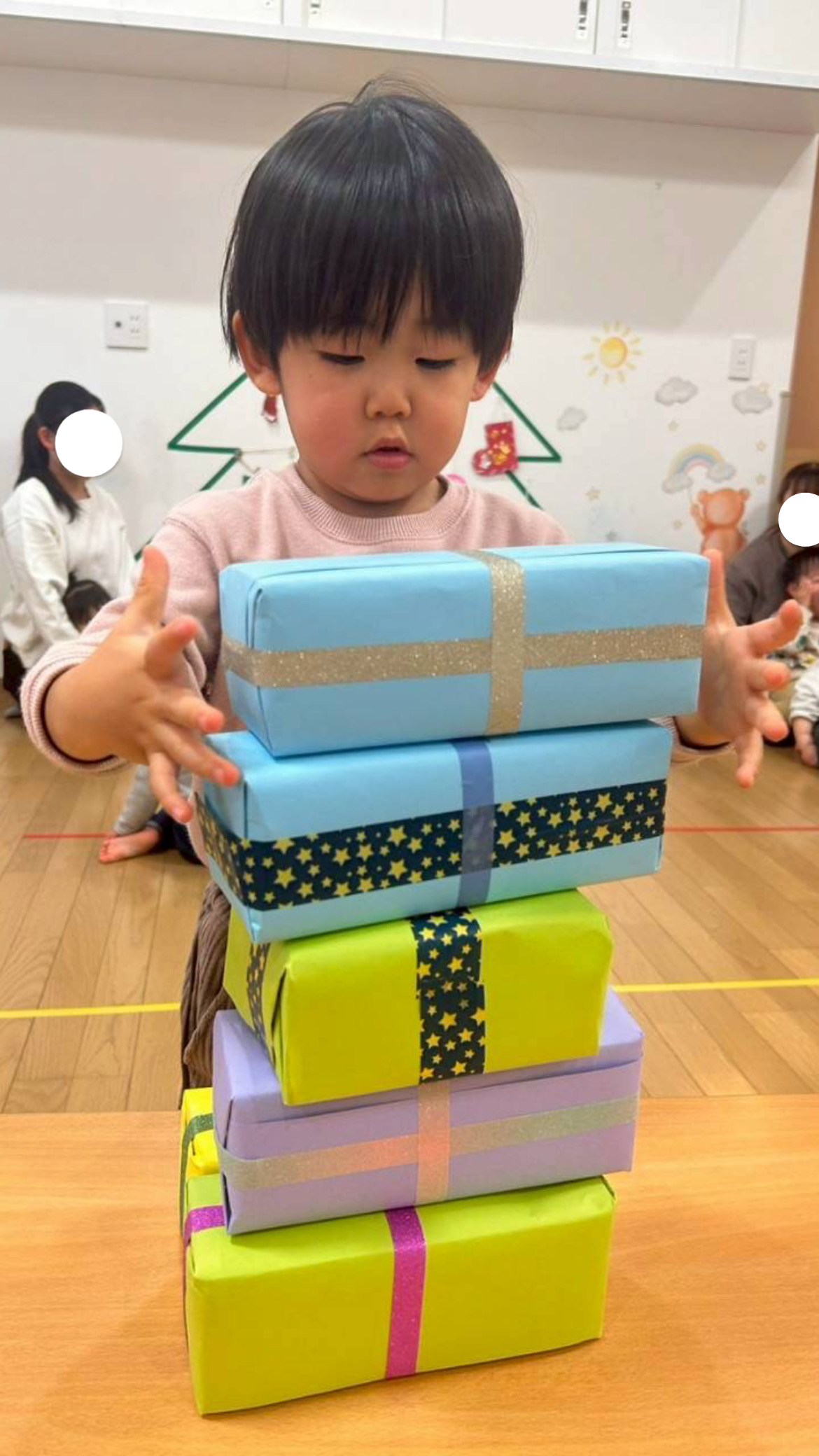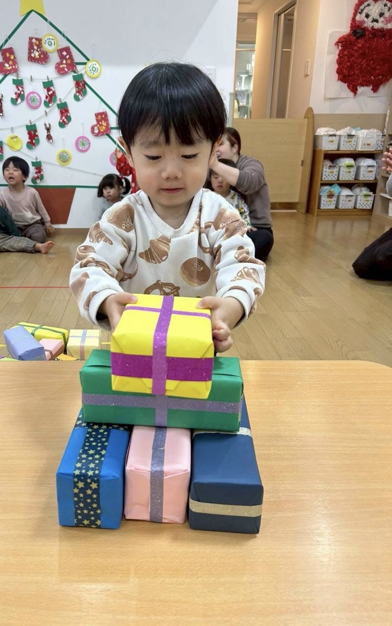 「プレゼント積みゲーム」では2チームに分かれて協力しながら真剣に積んでいました🎁待っている子も“がんばれー”と沢山応援してくれていました♬