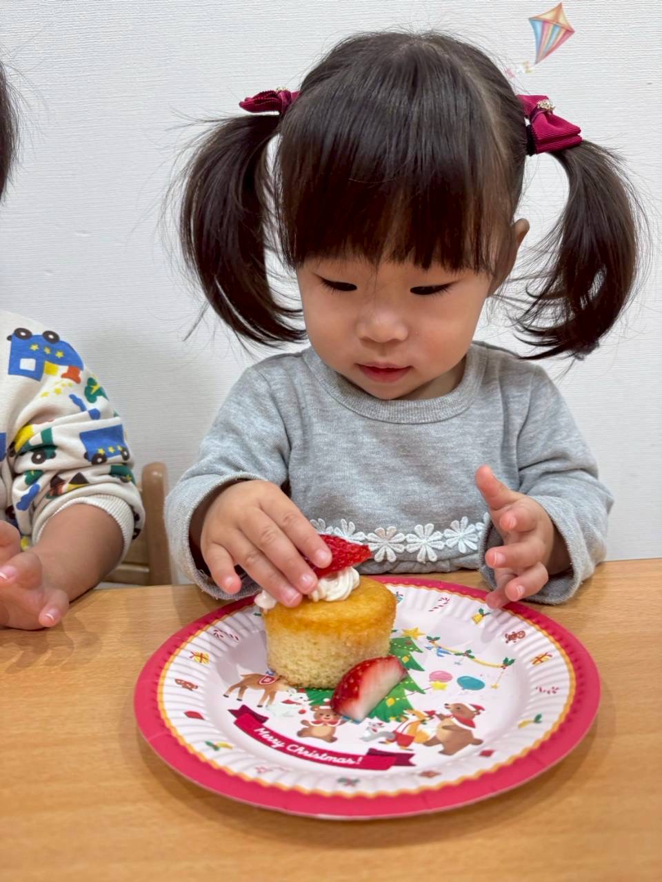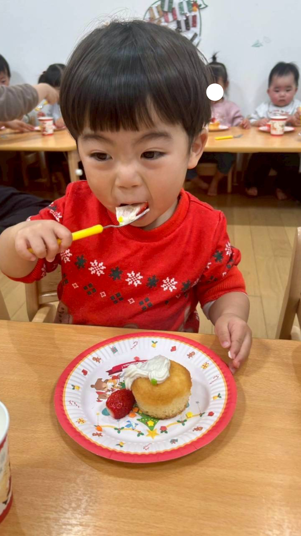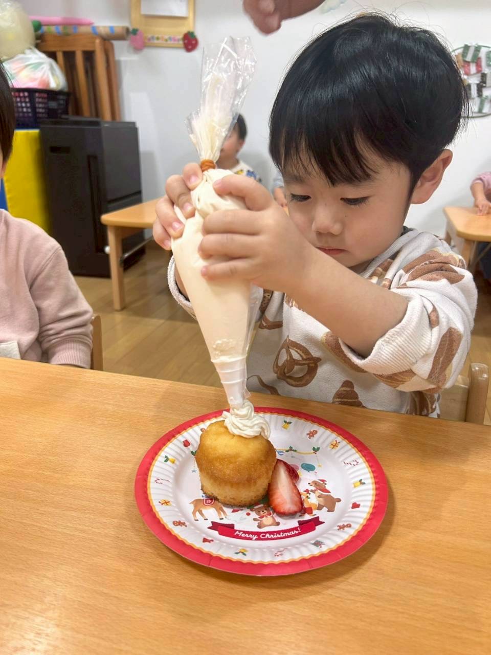 おやつはクリスマスケーキを自分で作ってみました🎶ヨーグルトクリームやいちご、カラフルなシュガーを好きなようにのせてみました🍓